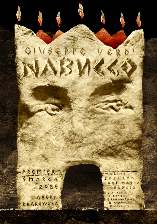 1. Opera Krakowska Nabucco plakat proj. Damian Styrna Z mroku wyłania się oświetlona tajemniczym, złotawym blaskiem płaska powierzchnia z kamienia przypominająca ludzką twarz. Twarz nie ma nosa. Spogląda groźnie na prawo i otwiera szeroko usta, przypominające wejście do ciemnej jaskini. Jej skronie zdobi siedem trójkątnych form układających się w kształt korony, nad którą palą się pojedyncze płomyki.